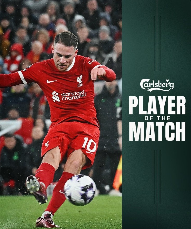 麦卡利斯特凭借这粒世界波进球以及全场出色表现,赛后也当选了利物浦官方评选出的本场比赛队内最佳球员。