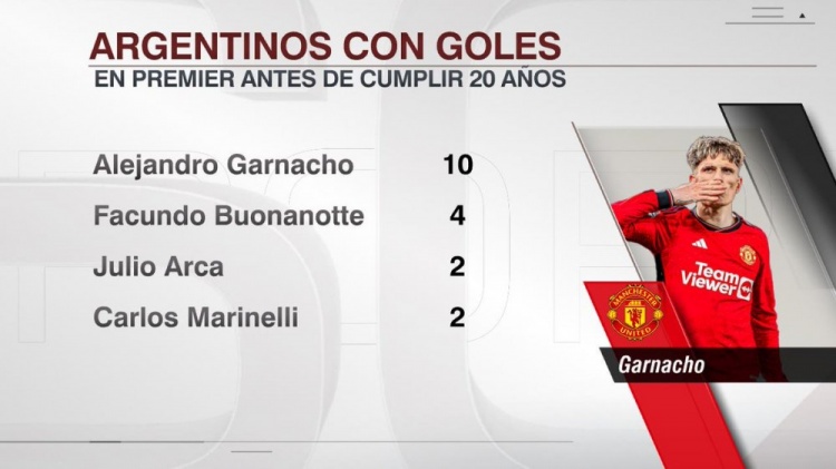 4月5日讯 在英超第31轮比赛中,加纳乔梅开二度,最终曼联客场3-4不敌切尔西,ESPN指出,加纳乔是20岁之前英超进球最多的阿根廷球员。