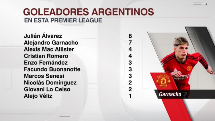 4月5日讯 在英超第31轮比赛中,加纳乔梅开二度,最终曼联客场3-4不敌切尔西。据ESPN统计,本赛季加纳乔攻入7粒英超进球,在阿根廷球员中仅少于阿尔瓦雷斯。