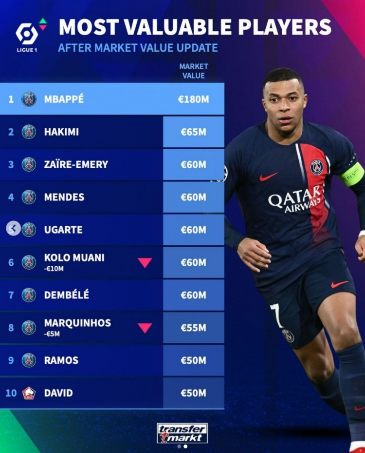 3月20日讯 德转更新了球员身价,并盘点了最新法甲球员身价榜,其中姆巴佩以1.8亿欧遥遥领先,以下为具体榜单(身价相同年龄小者在先):