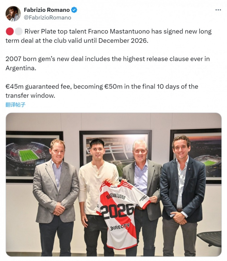 3月20日讯 据知名记者罗马诺透露,河床16岁中场马斯坦托诺新合同的解约金为4500万到5000万欧,创造阿根廷国内联赛球员解约金最高纪录。
