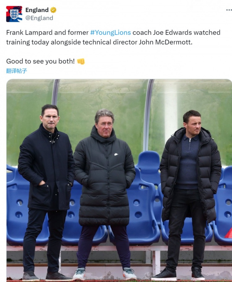 英格兰队正在备战3月份对阵巴西、比利时的友谊赛,兰帕德与前英格兰青年队主帅乔-爱德华兹、技术总监麦克德莫特一起观看了球队的训练。英格兰队官方账号在社交媒体上晒出照片,欢迎兰帕德的到来。