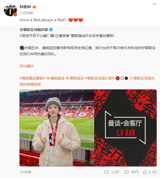 03月20日讯 今日曼联官方发布了对“红魔使者”鹿晗的采访,随后鹿晗也在社媒上示爱曼联:Once a Red,always a Red!❤️❤️❤️