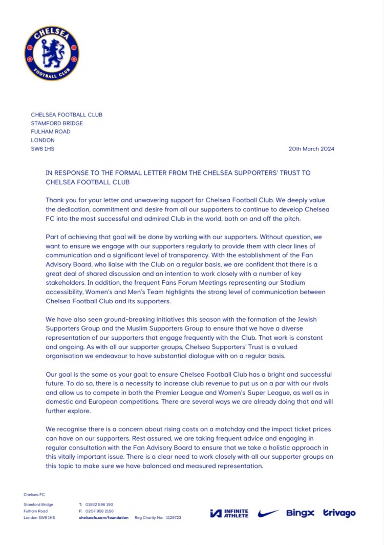 作为对切尔西球迷信托基金给切尔西足球俱乐部的正式信函的回应,感谢您的来信和对切尔西足球俱乐部的坚定支持。我们非常重视所有球迷的奉献、忠诚和愿望,他们将继续把切尔西发展成为世界上最成功、最受尊敬的俱乐部,无论是在球场上还是在球场下。