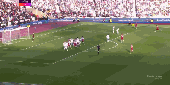 伤停补时阶段,西汉姆联前场右路任意球罚入禁区,造成门前混战后将球打进。随后,VAR裁判组介入,进行了长达5分半中的检查,并要求主裁判贾雷德-吉列亲自去场边看监视屏。经过检查,吉列最终判定有西汉姆球员手球,进球无效。