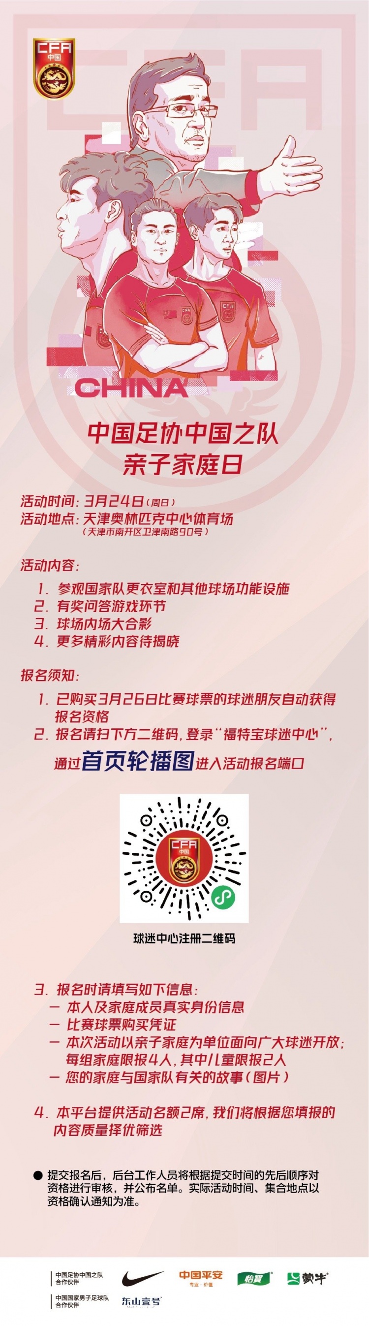 据悉,“足球中国”昨日刚刚发布了中国国家男子足球队球迷见面会的招募信息。很多球迷纷纷留言,希望此类与国家队近距离互动的机会能够更多。为了感谢广大球迷的热爱与支持,今日同时启动中国足协中国之队亲子家庭日和3月26日比赛牵手球童活动的招募工作。