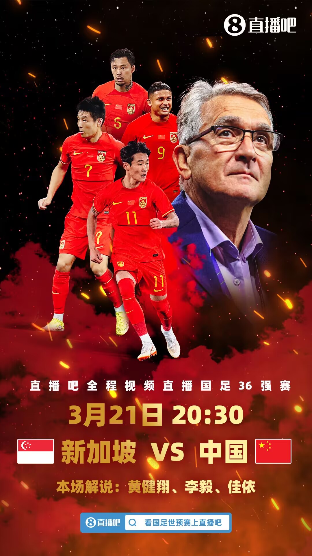 3月21日讯 北京时间今晚20点30分,世预赛亚洲区第二阶段C组第3轮,国足客场挑战新加坡。将为吧友们带来视频直播,黄健翔搭档李毅带来本场比赛的解说。直播间链接