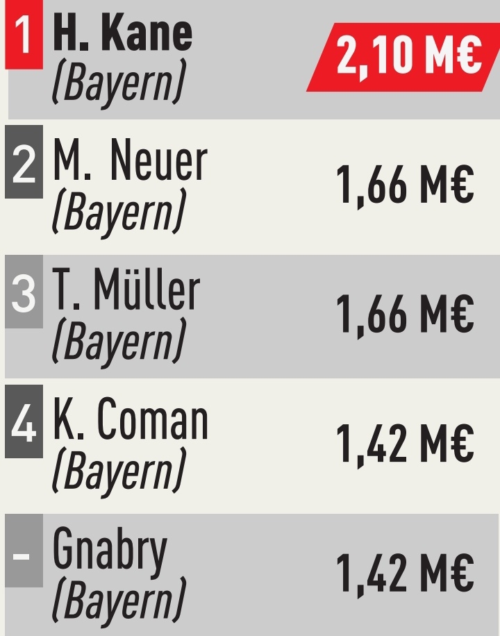 03月21日讯 《队报》统计了德甲球员月薪排行,凯恩以210万欧排名第1,前5名均为拜仁球员。