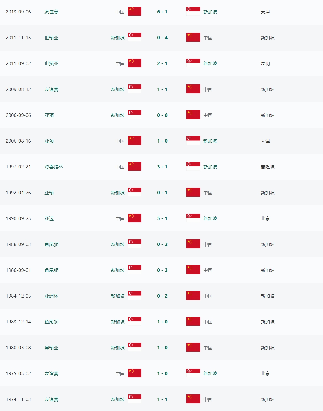 国足此前三场面对新加坡,先后取得了2-1、4-0和6-1的比分。上一次国足面对新加坡未能取胜,是在2009年8月的友谊赛中。