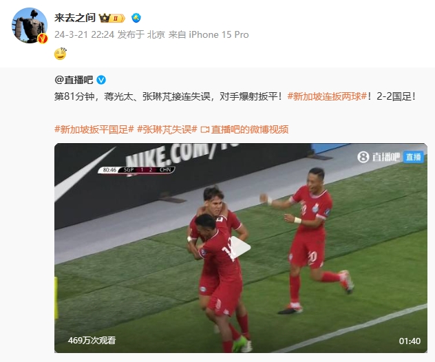 比赛第81分钟,蒋光太、张琳芃接连出现低级失误,新加坡队爆射破门将比分扳平。