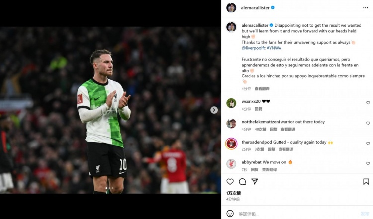 本场比赛麦卡利斯特表现不俗,还有一粒进球入账。赛后他也在个人社媒发文谈到本场失利,他写道:“对没能取得想要的结果而感到失望,但是我们会从中吸取教训,高昂起头颅继续前进。感谢远道而来的球迷一直以来对我们热情的支持。”
