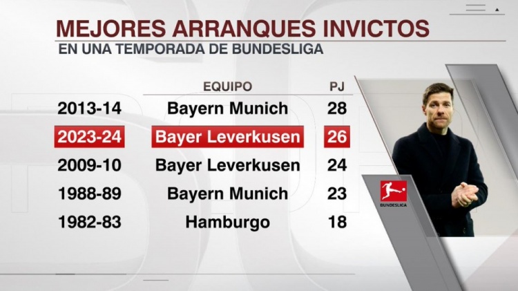 3月18日讯 在德甲第26轮比赛中,勒沃库森客场3-2击败弗赖堡。据ESPN统计,勒沃库森本赛季德甲开局26场不败,德甲历史上仅次于2013-2014赛季拜仁。