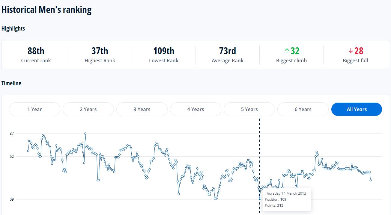 国足历史最高排名是37名(1998年12月),历史最低排名是109名(2013年3月)。