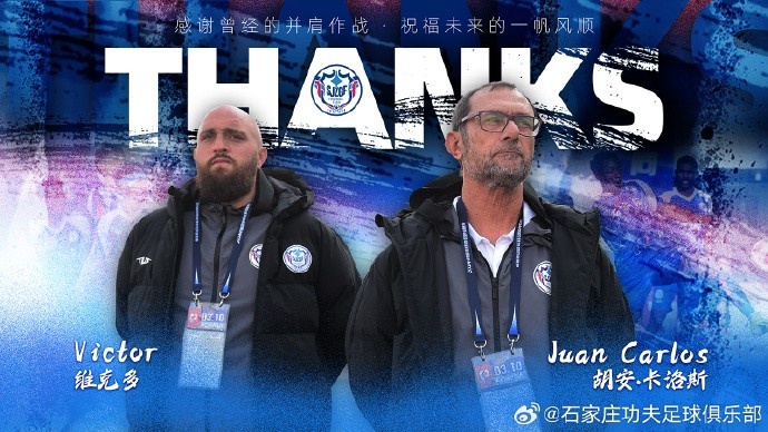 感谢胡安-卡洛斯先生及其助手维克多在执教期间的辛勤付出,祝福卡洛斯先生在未来的工作和生活中一切顺利。石家庄功夫足球队全体人员将全力以赴打好接下来的比赛,坚定目标、砥砺前行。