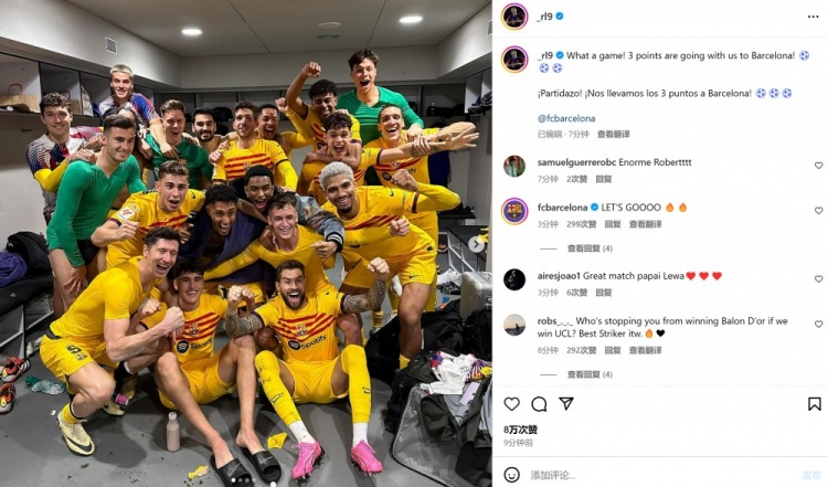 赛后莱万也在个人社媒晒出巴萨众将在更衣室庆祝合影,配文写道:“多么精彩的比赛,我们要把3分带回巴塞罗那了!”