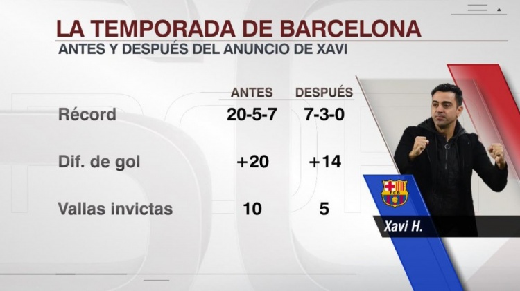 哈维宣布离任之前,巴萨本赛季的战绩为20胜5平7负,净胜20球,完成10场零封,他宣布赛季末离任之后,巴萨7胜3平保持不败,净胜14球,完成5场零封。