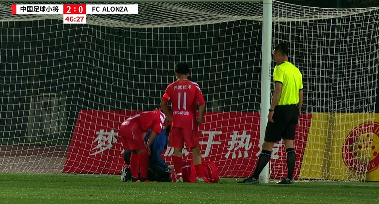 进球后,7号小将沙明因撞到门柱痛苦倒地,因伤被换下。