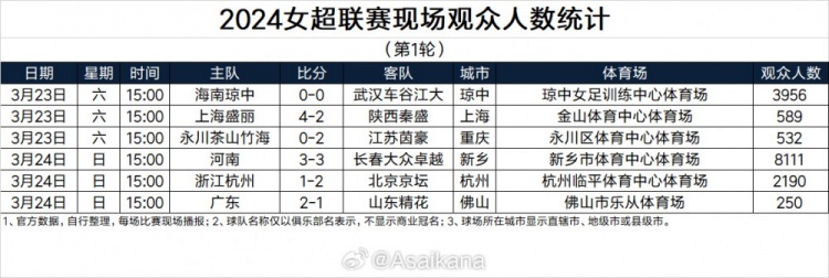 2024女超联赛现场观众人数统计(第1轮)