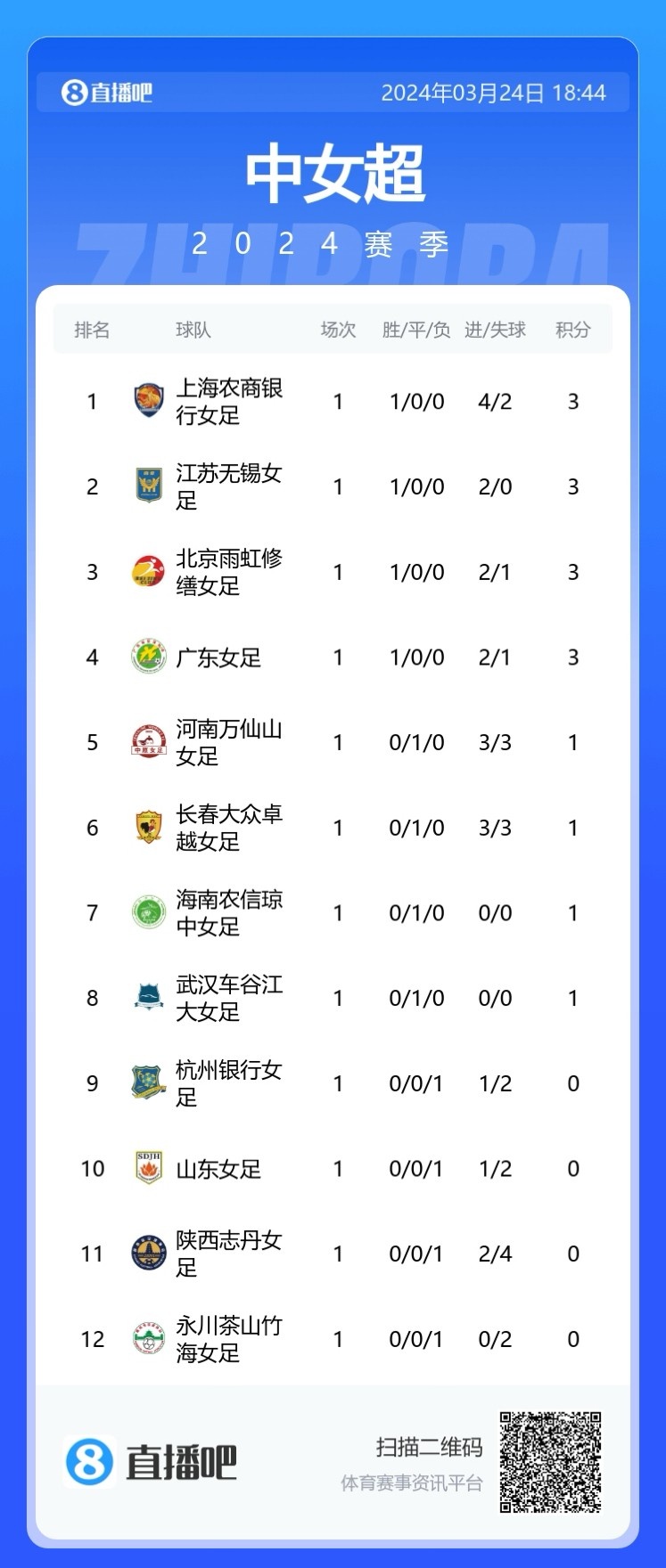 3月24日讯 女超联赛第一轮今天结束最后3场较量,北京女足2-1击败杭州女足,河南女足3-3长春女足。