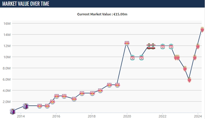 但进入新赛季,南野拓实一开始便以出色的状态锁定主力位置,前4轮法甲贡献3球3助,赛季进行到现在,南野拓实已经出战24场比赛,共计1666分钟,作为前腰贡献6球5助。他的身价也从600万欧一路涨至生涯新高的1500万欧。