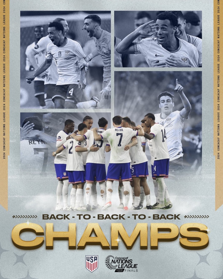3月25日讯 2023-24赛季中北美及加勒比海地区国家联赛决赛,美国2-0击败墨西哥实现三连冠。