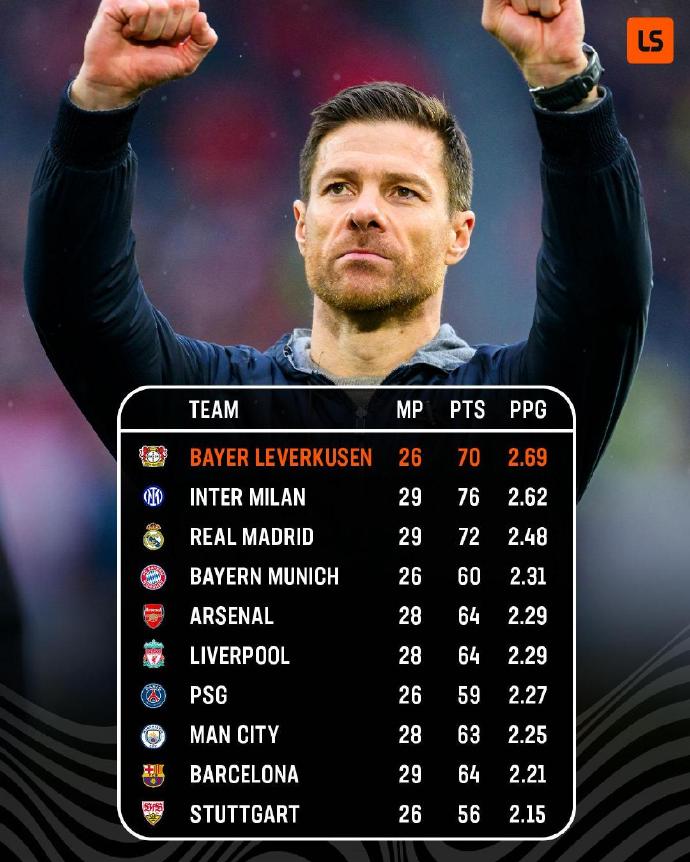 五大联赛场均拿分排行:勒沃库森不败领跑 国米第二 皇马第三