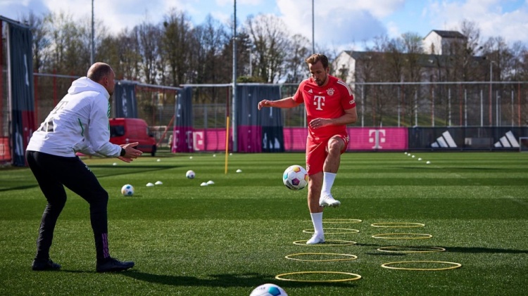 凯恩在此前对阵达姆施塔特的比赛中脚踝受伤,他因此提前从本期英格兰国家队中离开,周一上午他在训练场上进行个人训练,体能训练主管布罗伊西陪伴他完成了有球训练。