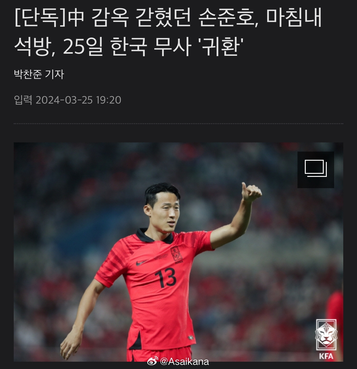 韩国媒体报道,此前在中国因非国家工作人员受贿罪被捕的韩国球员孙准浩已被释放,并于今日下午落地韩国。
