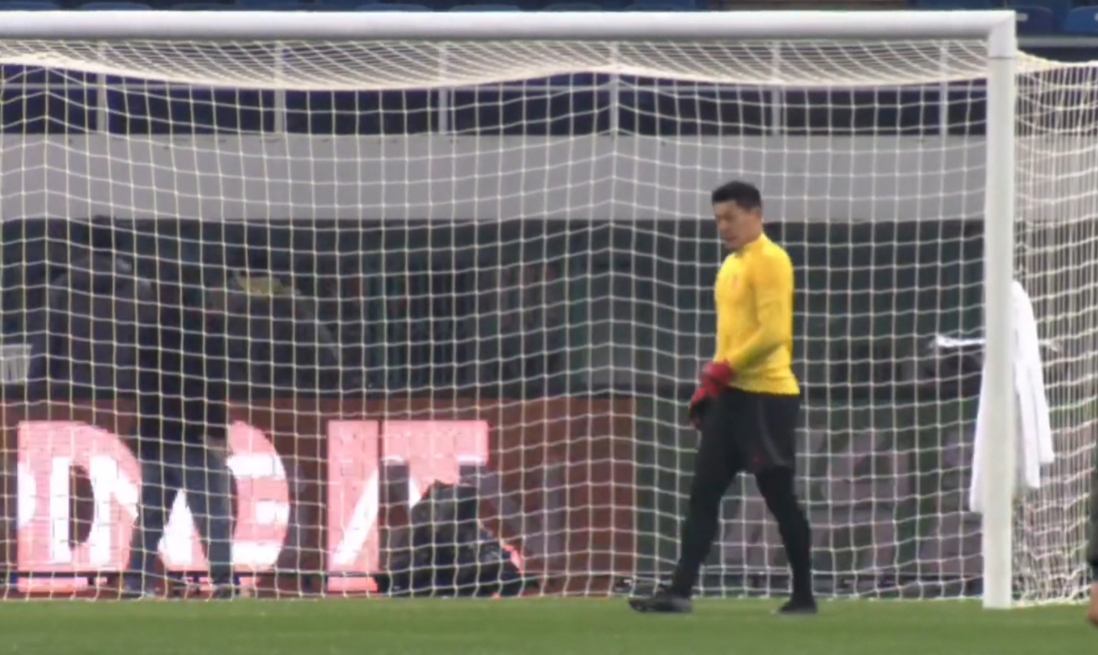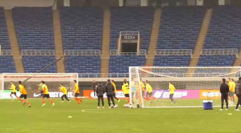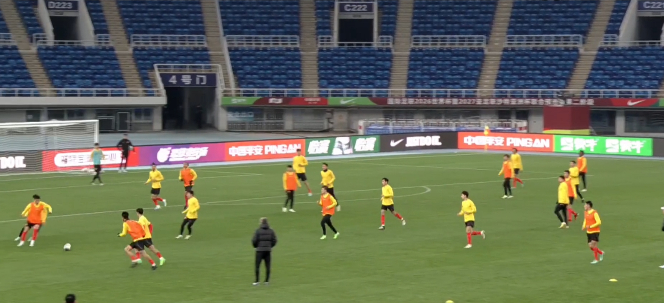3月25日讯 中国男足今天进行公开训练,镜头中可以看到,武磊、费南多等11名球员身穿背心进行训练。