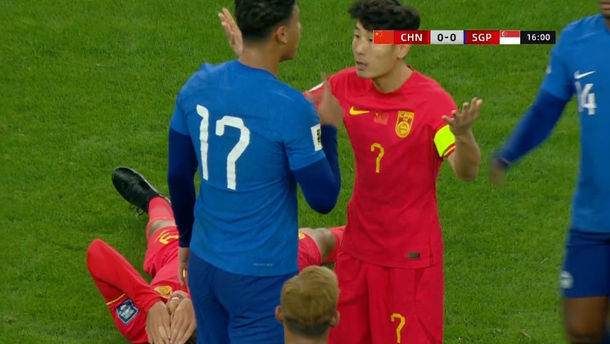 第17分钟,张玉宁在争顶时被撞倒,国足队长武磊随后与新加坡17号伊尔凡-凡迪贴脸对峙,随后双方球员上来息事宁人。
