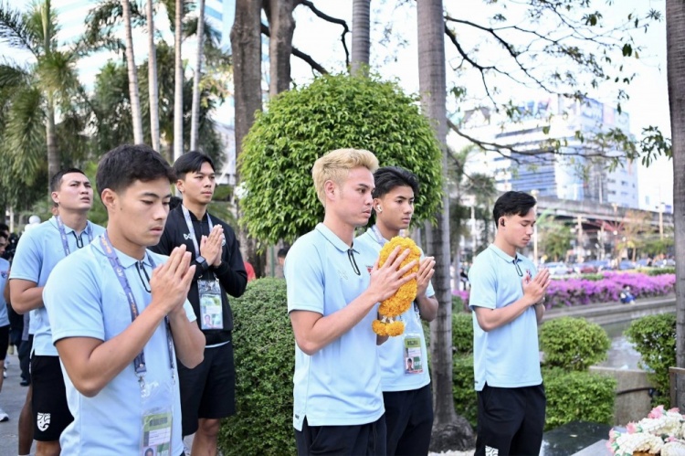 3月26日讯 据泰国足协报道,泰国足协主席伍伦盼女士和国家队球员们一起,在主场对阵韩国队的赛前进行了祈福活动。