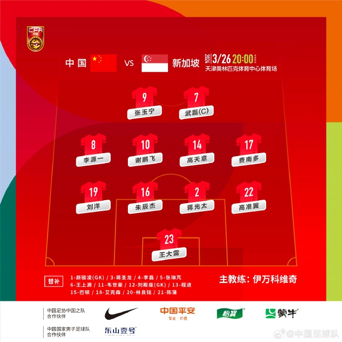 中国VS新加坡,王大雷、高准翼和高天意获得首发机会