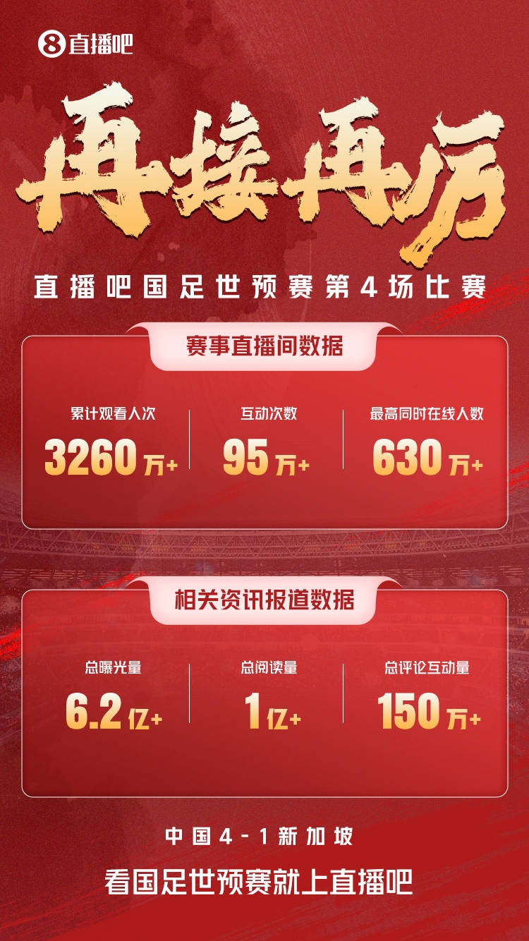 今天国足36强赛,累计观看人次达到了3260万+!最高同时在线人数630万+!