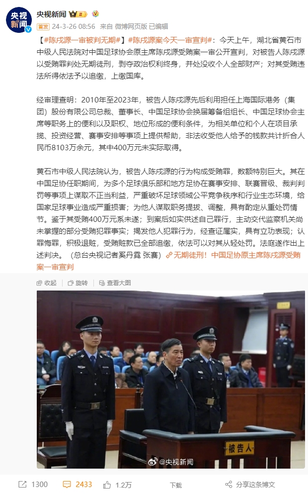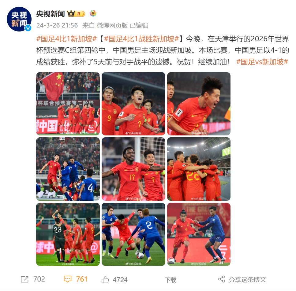 央视新闻报道国足4-1胜新加坡,上一条足球相关微博是陈戌源判刑