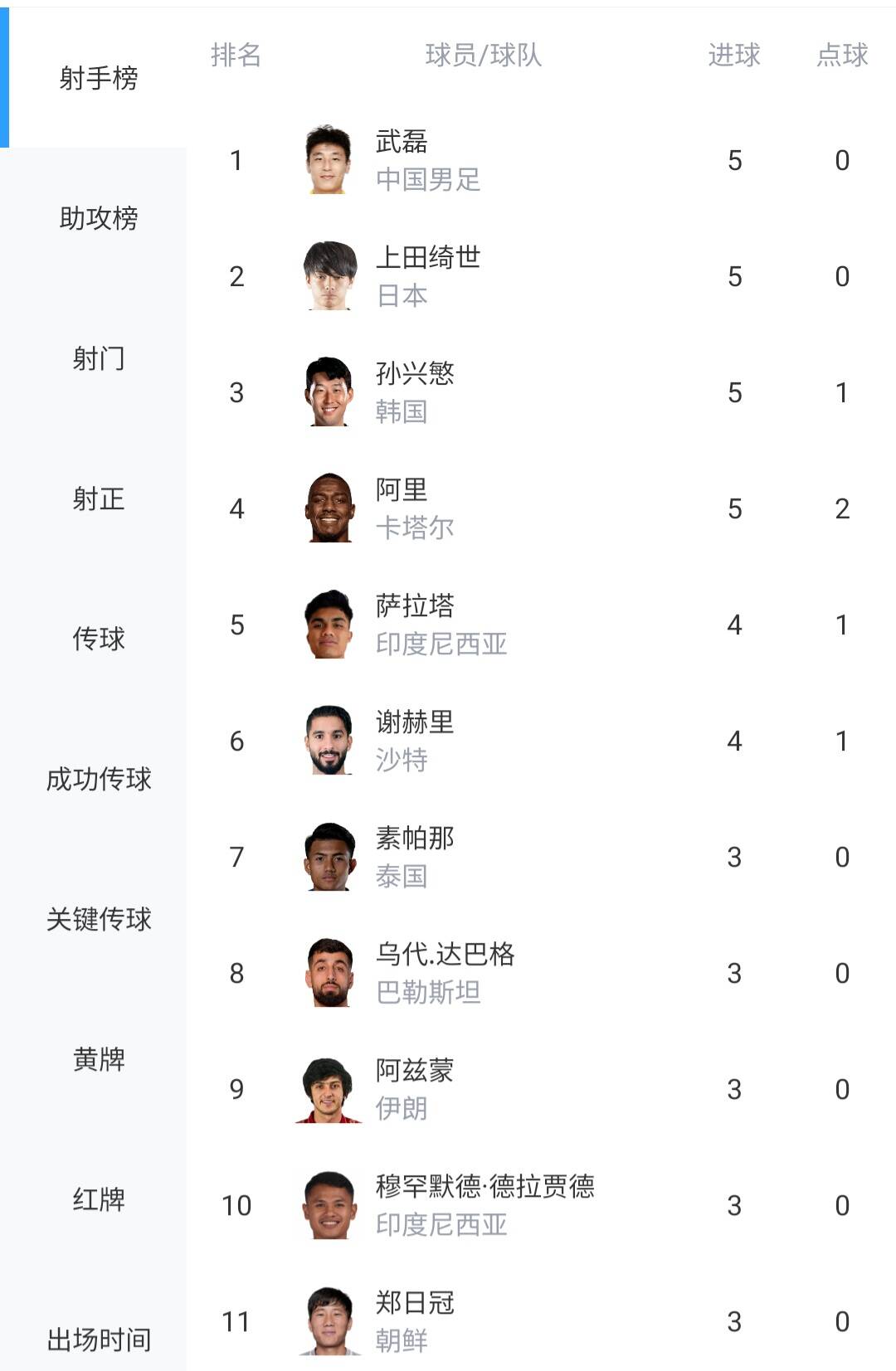 03月26日讯 世预赛亚洲区C组第4轮,国足4-1战胜新加坡,武磊凭借2射1传的表现,登顶世预赛射手榜,追平上田绮世、孙兴慜和阿里等球员。