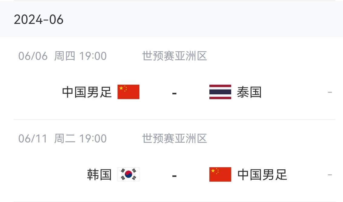 剩下最后两轮将在6月进行,国足将先主场对阵泰国,再客场对阵韩国。