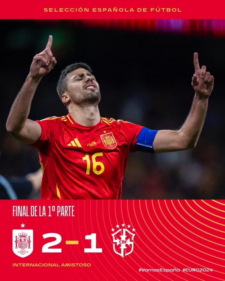 3月27日讯 足球友谊赛,西班牙主场迎战巴西。上半场,罗德里点射建功,奥尔莫个人秀破门,亚马尔造点+助攻,乌奈-西蒙送礼罗德里戈冷静挑射扳回一球。半场战罢,西班牙2-1巴西。