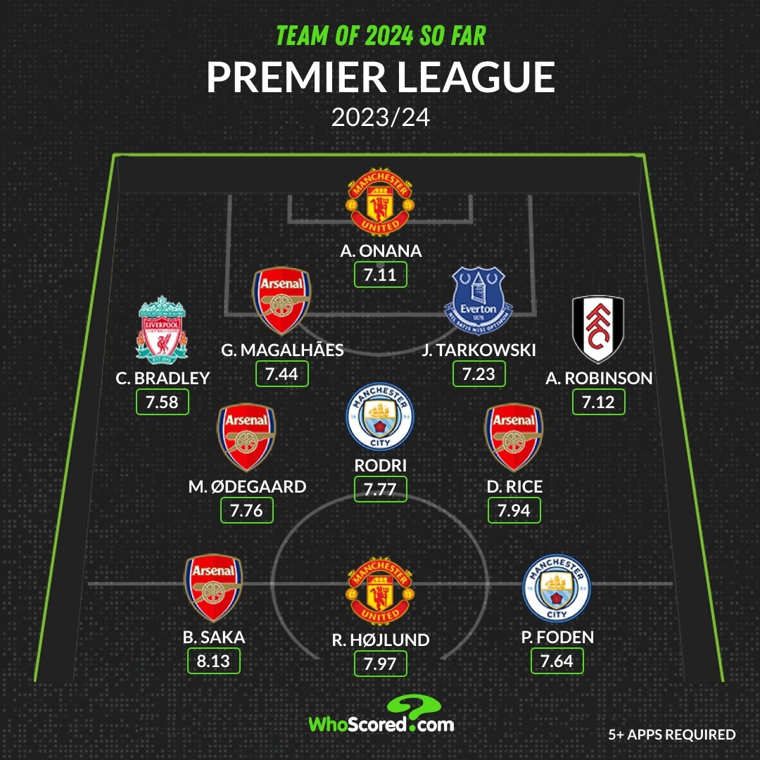 3月27日讯 评分网站WhoScored公布了2024年至今,英超联赛的最佳阵容,萨卡场均8.13分最高,阿森纳4人在列,曼城、曼联各两人入选。