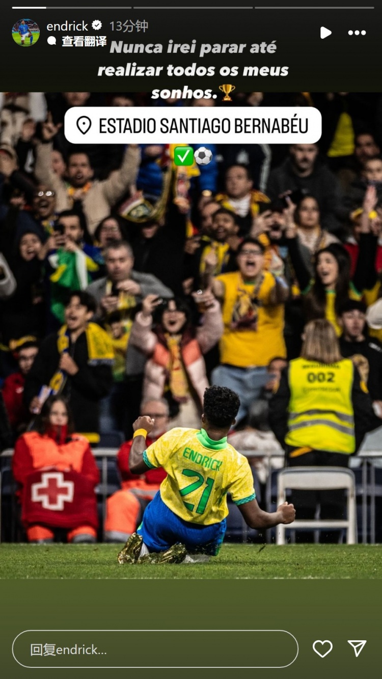 恩德里克连续两场比赛为巴西破门,他在社交媒体上晒出自己庆祝进球的照片,并配文:“我永远不会止步,直到我实现所有的梦想。”