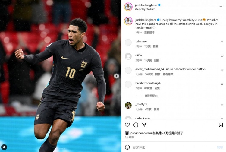 赛后贝林厄姆也在个人社媒晒出庆祝进球的照片,配文写道:“终于打破我在温布利球场进球荒,本周球队经历了很多挫折,为我们给出的回应而感到骄傲。我们夏天再见!”