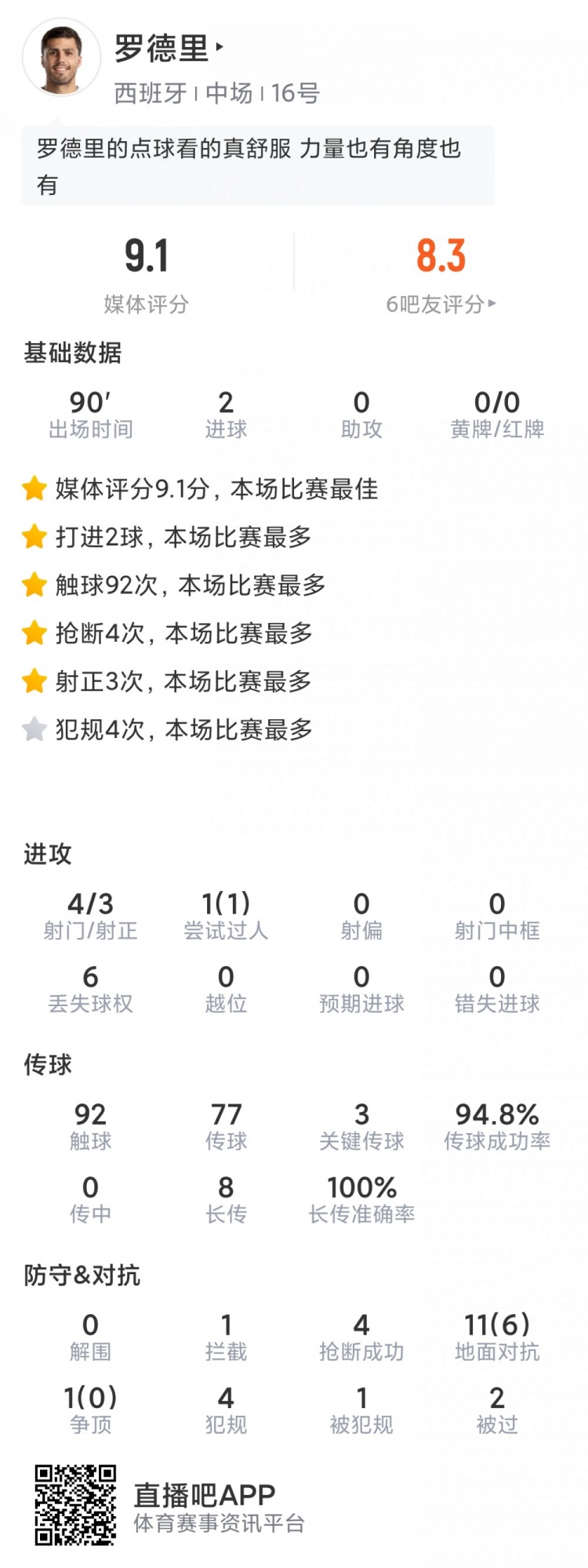 3月27日讯 在友谊赛西班牙3-3战平巴西的比赛中,罗德里点射双响,以下为他在本场数据: