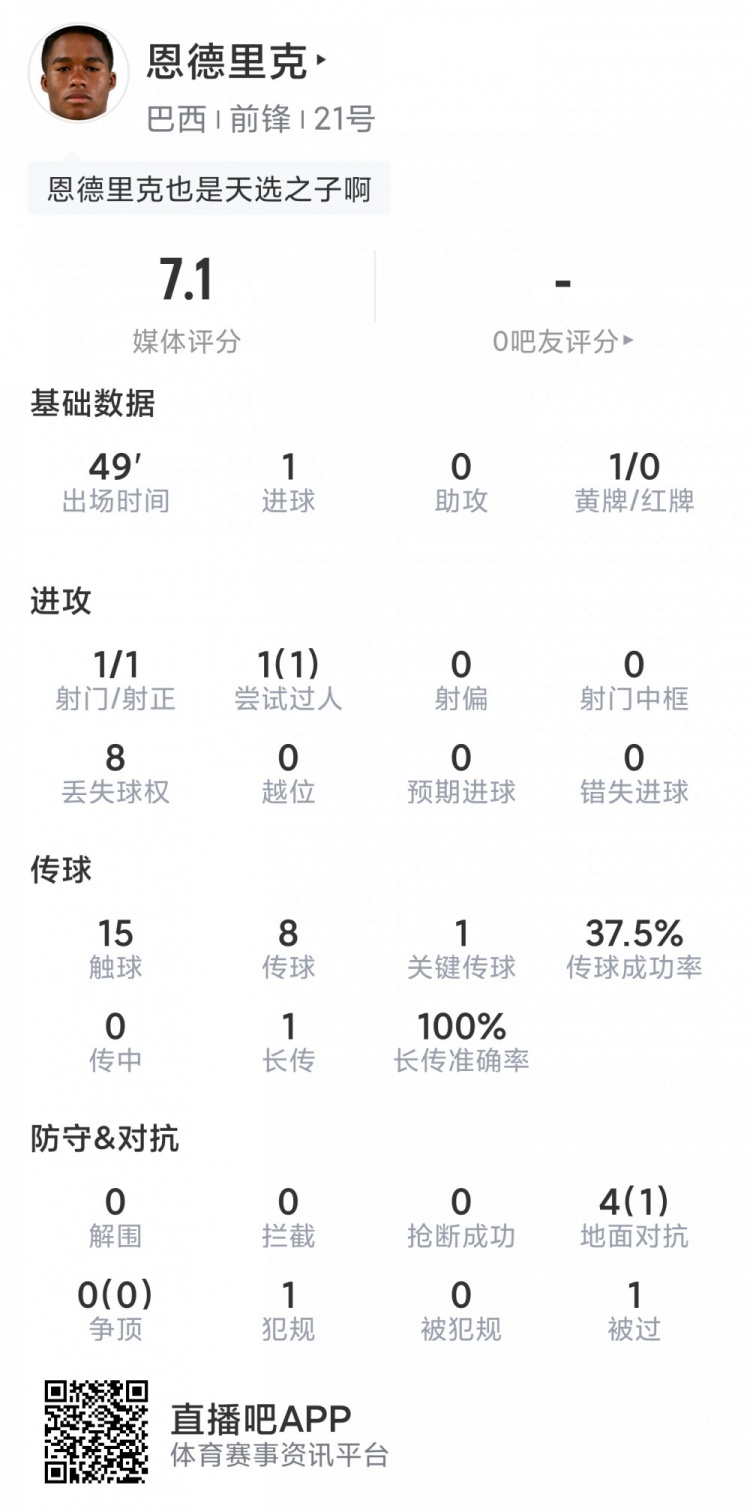 3月27日讯 在友谊赛巴西3-3战平西班牙的比赛中,恩德里克替补建功,以下为他在本场具体数据: