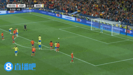 补时阶段,卡瓦哈尔禁区倒地后用手拉拽加莱诺的脚致其倒地,裁判判罚点球!帕奎塔点射命中,巴西在最后时刻3-3绝平西班牙!