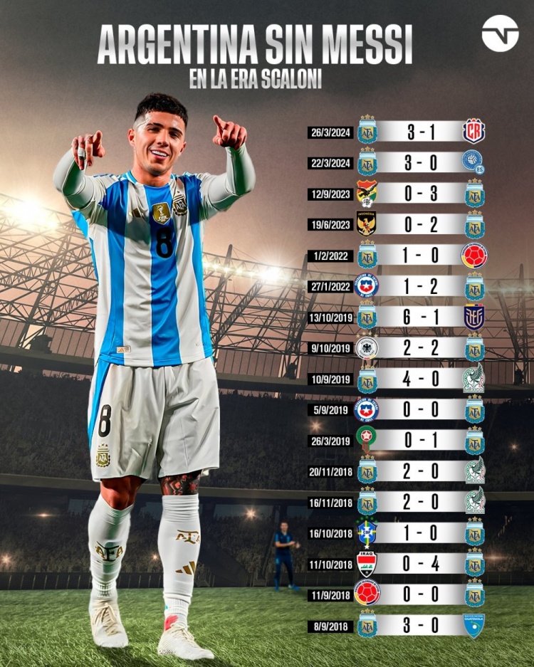 据TNT统计,自斯卡洛尼执教以来,阿根廷国家队在缺少梅西时的战绩为13胜3平1负。