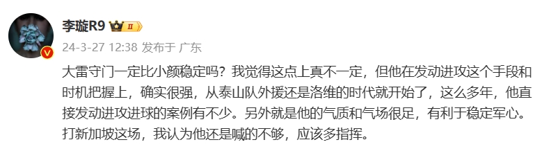 李璇:大雷守门一定比小颜稳定吗?我觉得这点上真不一定,但他在发动进攻这个手段和时机把握上,确实很强,从泰山队外援还是洛维的时代就开始了,这么多年,他直接发动进攻进球的案例有不少。另外就是他的气质和气场很足,有利于稳定军心。打新加坡这场,我认为他还是喊的不够,应该多指挥。