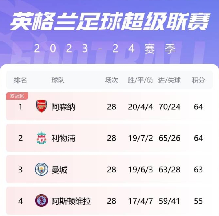 英超争冠三强分差1分:阿森纳64分,利物浦64分,曼城63分