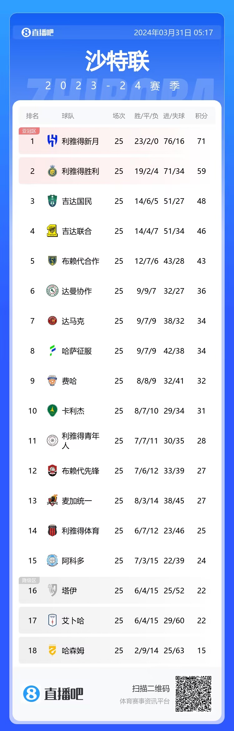 3月31日讯 沙特联第25轮,利雅得胜利5-1十人塔伊,利雅得新月4-3利雅得青年。