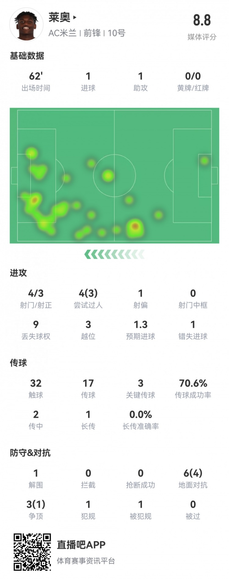 3月31日讯 本轮意甲,米兰暂2-1领先佛罗伦萨。莱奥首发出战62分钟被换下,球员全场重点数据如下↓