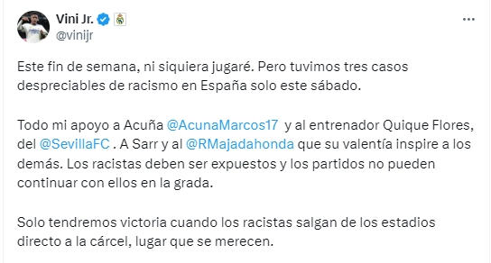 维尼修斯写道:“本周末我甚至不会登场比赛(维尼修斯停赛)。但仅仅在周六,西班牙就分别发生了三起卑鄙的种族主义案例。我把所有的支持都给到阿库尼亚@AcunaMarcos17和来自塞维的教练@Quique Flores。对于萨尔和@RMajadahonda(马哈达翁达闪电俱乐部),希望他的勇气能鼓舞他人。种族主义者必须遭到曝光,其他人不能在看台继续与他们一起。只有当种族主义者直接由体育场被送往他们应去的监狱时,我们才会取得胜利。”