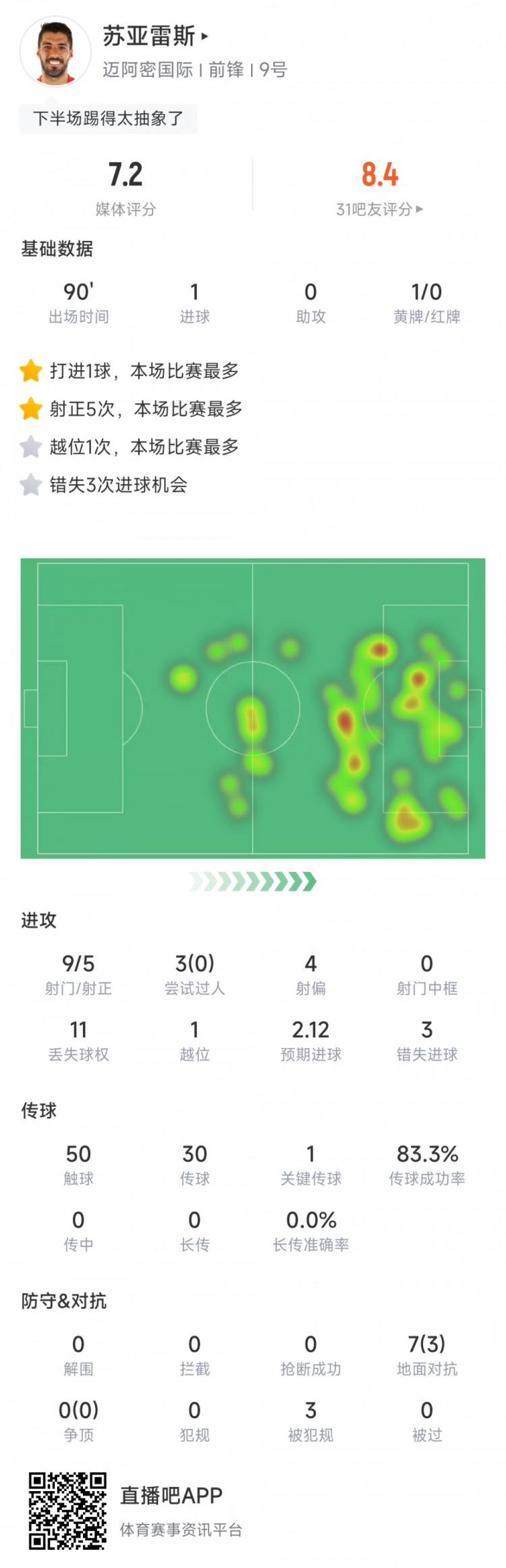 苏亚雷斯本场比赛数据: